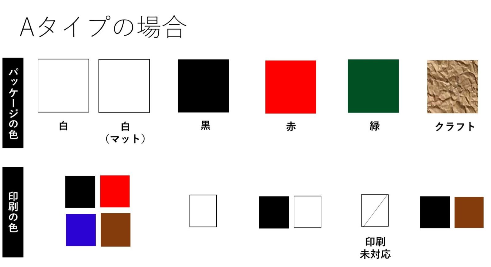 Aタイプの場合、パッケージによって印刷できる色が異なりますので、下記の図にてご確認ください。