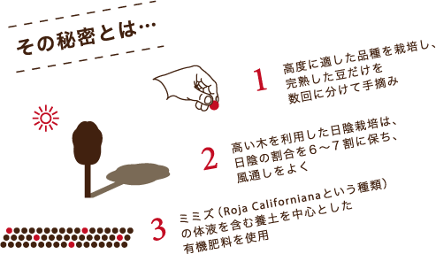 伝統的にコーヒーの栽培をおこなっているマヤ先住民の知恵と工夫は、この3つの秘密を中心に大切に守られています。 このような条件で育てられたコーヒーを、完熟期のうちにひとつひとつ手摘みをし、収穫直後の天日干しにより適切な水分含量の管理を行い、生産者組合による直販で海を渡ります。