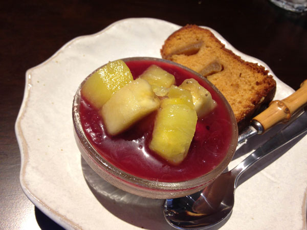 ココアのババロアの上にかかっているのはルバーブ、ベリー、さくらんぼのコンフィチュール